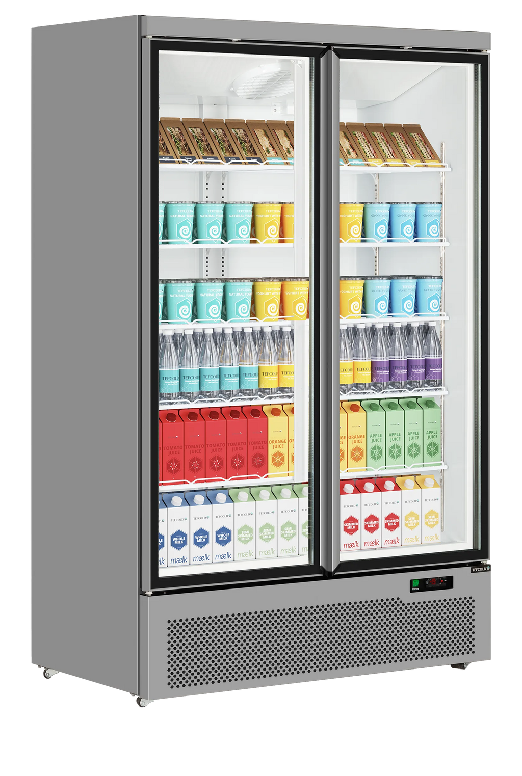 High-Capacity Double Door Display: Features 2 self-closing, double-glazed hinged glass doors with edge-to-edge “frameless” design, offering excellent visibility and easy access for chilled food and beverage displays.