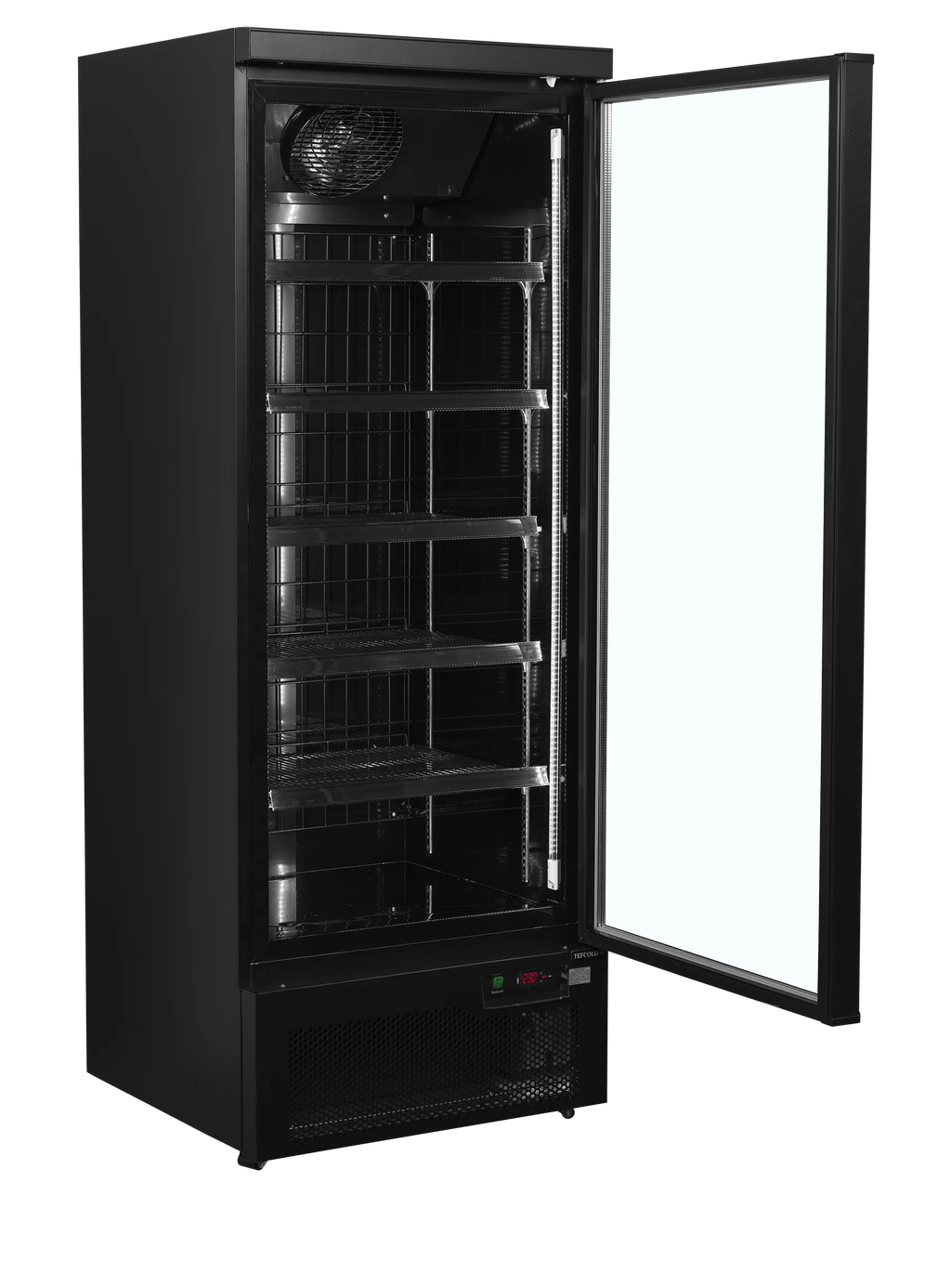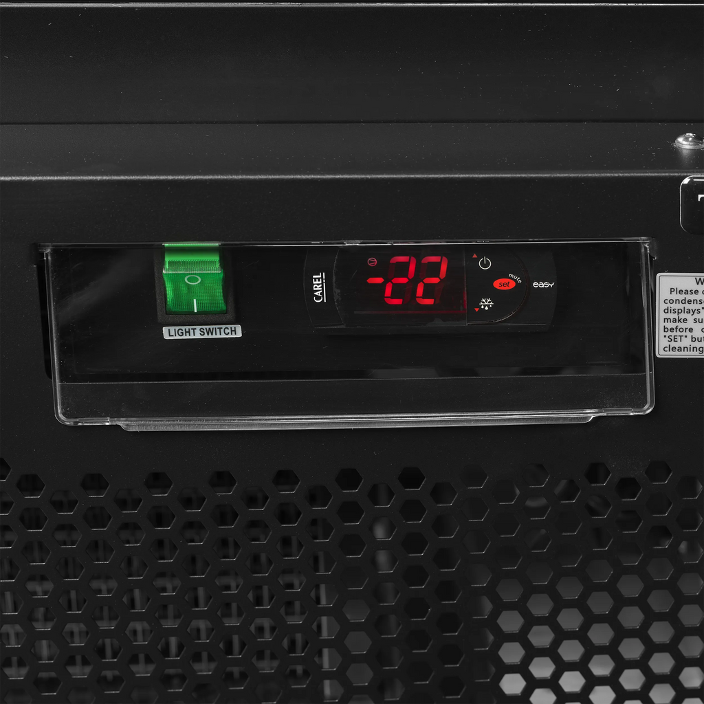 The Atom Maxi F1DBB Display Freezer is a stylish and high-capacity commercial upright freezer designed for professional frozen food merchandising. Featuring a sleek black interior and exterior finish, this unit combines modern aesthetics with reliable performance. The frameless, self-closing triple-glazed heated glass door ensures excellent product visibility while preventing condensation and maintaining energy efficiency. With a generous 560L gross capacity, 0.84m² display area, and five adjustable heavy-duty shelves, it provides flexible storage for a wide variety of frozen goods. The ventilated cooling system ensures consistent temperatures between -18°C and -22°C, supported by automatic defrost functionality to prevent ice build-up. Vertical LED lighting enhances product presentation, while the stainless steel mirror-effect base adds durability and visual appeal. Ideal for convenience stores, delis, and supermarkets, this freezer offers an efficient and competitively priced solution for professional frozen food display.