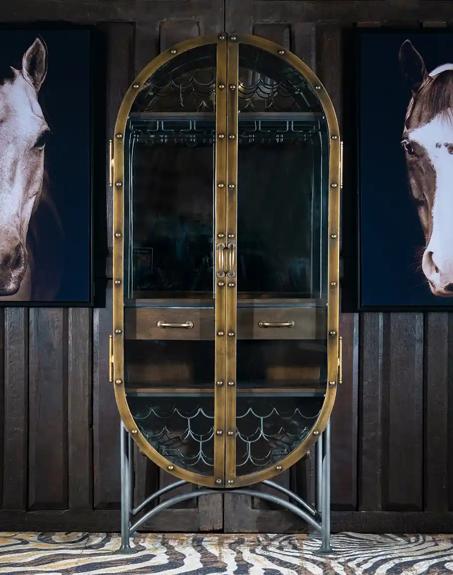 Cabinet Design: The cabinet features a distressed rustic hardwood finish on select hardwoods and veneers, complemented by an aged iron metal frame. Its footed metal legs are equipped with arched cross rails that connect all four legs. The oval-shaped bar cabinet showcases two distinct hinged doors, adorned with faux rivets, elongated hinges, and strap pulls finished in aged brass. These doors can open up to 180°. The upper half of the cabinet incorporates a mirrored back. To ensure stability on uneven or carpeted floors, adjustable levelers are located under each corner, enhancing safety.